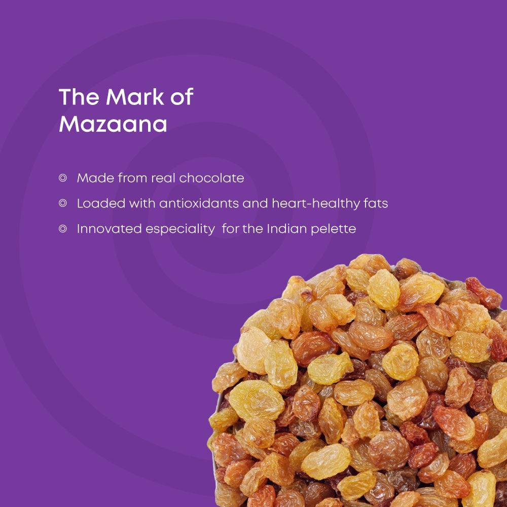 Nothing can be a sweeter treat than Mazaana's whole raisins coated with fine milk chocolate! It’s the texture of creamy milk delicately blended with pure cocoa that makes it much more deletable. There's nothing you’ll love more!