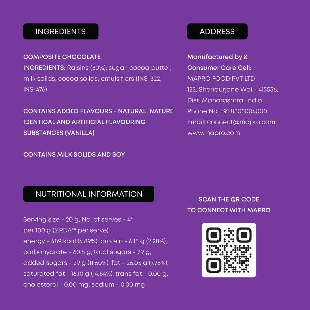 - Only the best cocoa beans sourced globally from select cultivators and sun-dried raisins from Sangli are blended perfectly to make a delectable bite.