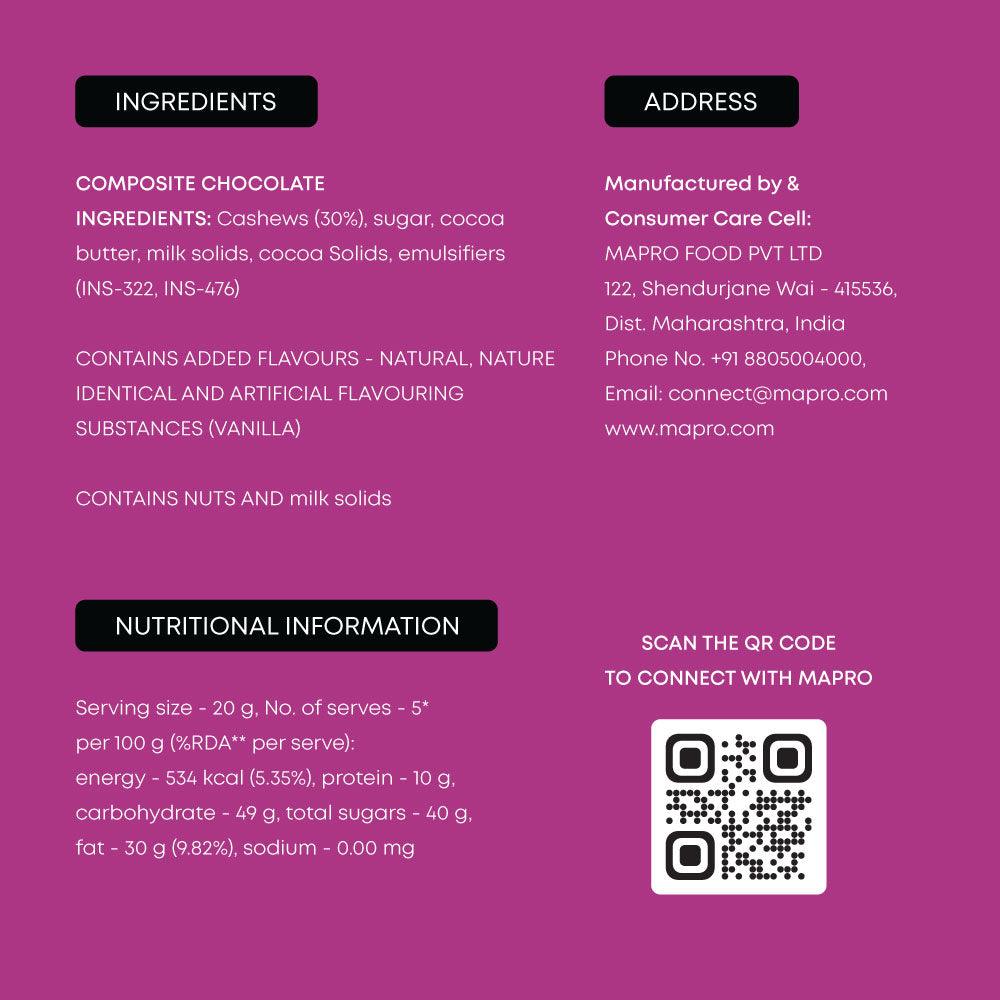 - Only the best cocoa beans sourced globally from select cultivators and creamy cashews from Vengurla are perfectly infused to make the buttery cashews coated in milk chocolate.